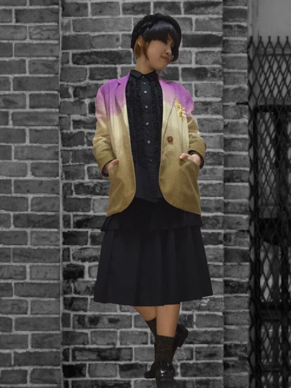 プリーツスカートの上に巻きプリーツでレイヤードで遊ぶ。 ジャケットの色味に合わせ、ラメゴールド入りのソックスをチョイス。