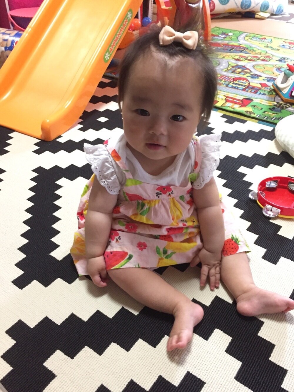 フルーツ柄のワンピ可愛い😂❤️ 上が男の子だったからか、女の子の服が異様に可愛く見える❤️✨ まだ髪の毛少ないけど、りぼんで女子力アップ🎀 そのうちおにーちゃんみたいに、あれヤダ、これがいい、って言うのかな😂 今だけでいいから、お母さんの着せたい服着させてね😍