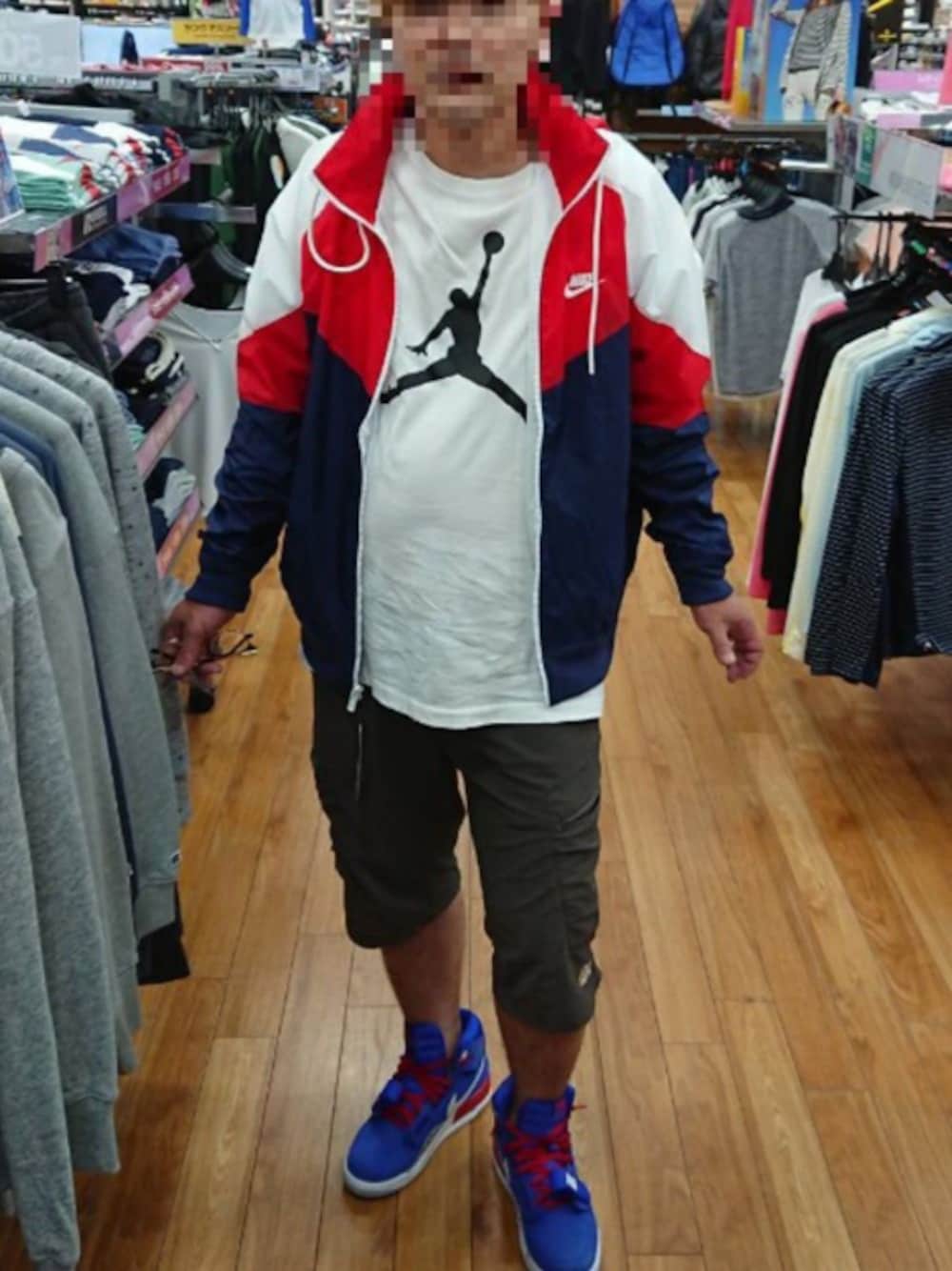 ブルー系のスニーカー、ブルー系のナイロンジャケットを着用したメンズの夏コーディネートの1枚目の写真