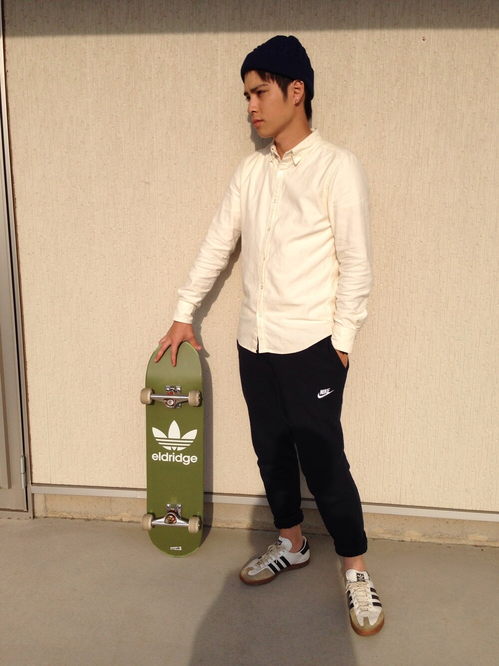 シャツ:トゥモローランド ボトムス:ナイキ スニーカー:アディダス ビンテージ ニット帽:ビームス デッキ:クリシェxアディダス スウェットスタイルは楽でいい感じですね!