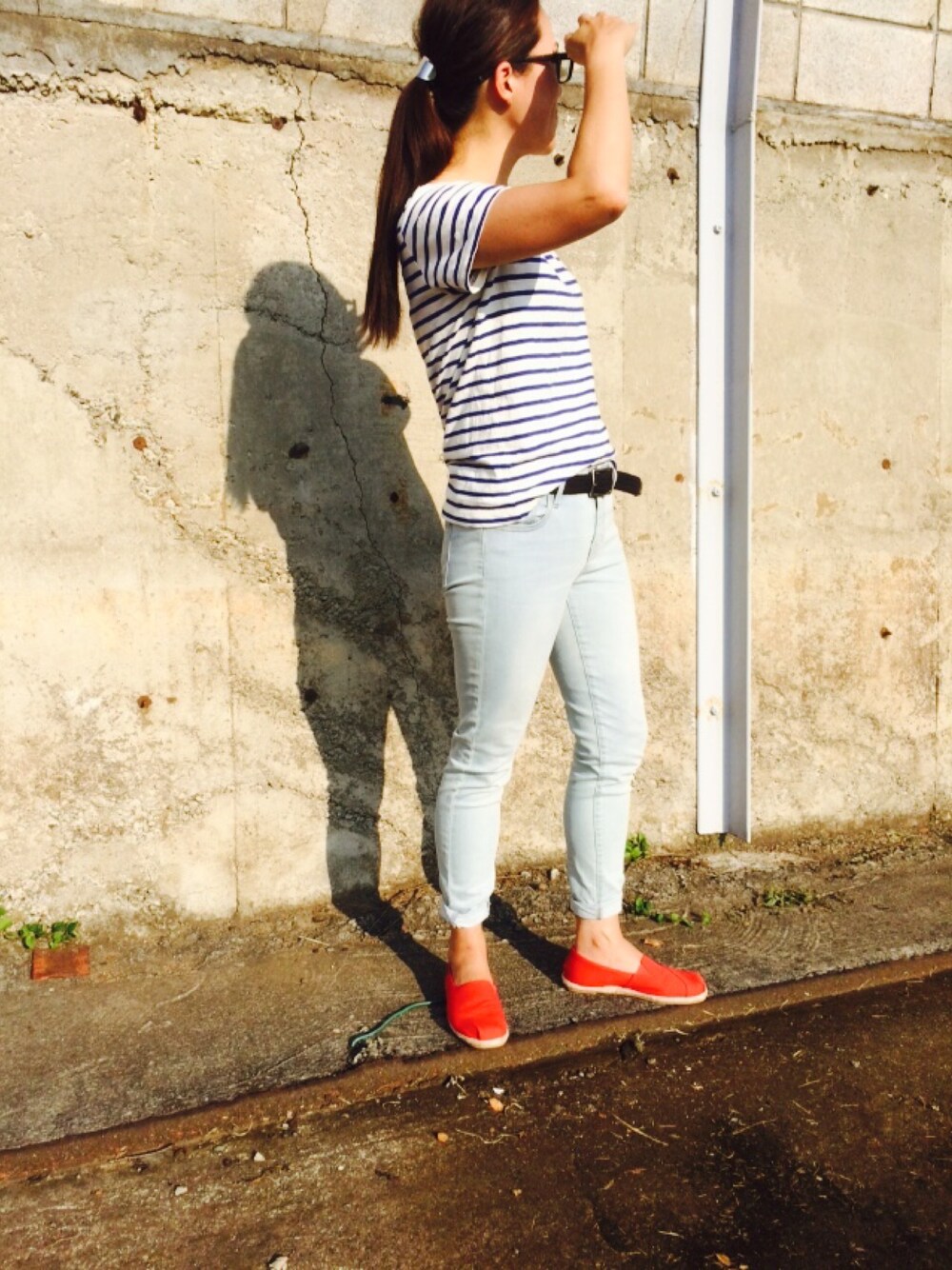 ちわ~っすね(*^^*) 今日も、どシンプル! 太ももがパツパツで(^^;;失礼します 真っ赤なエスパドリーユをポイントに チョイとマリンtasteにね♪ ハイ‼️以上で 片田舎からの中継でした~