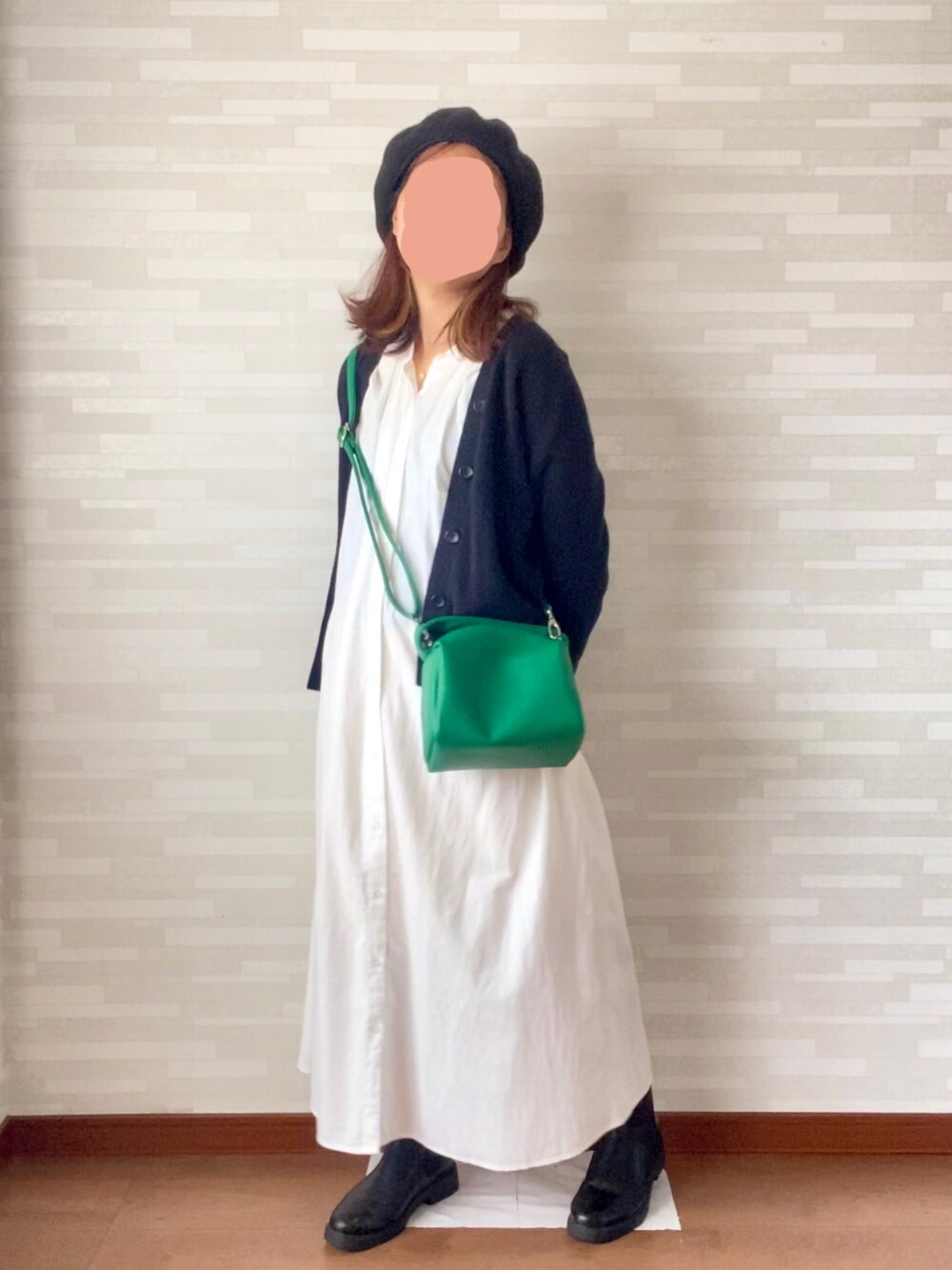 シンプルモノトーンコーデにカラーバッグで差し色✨