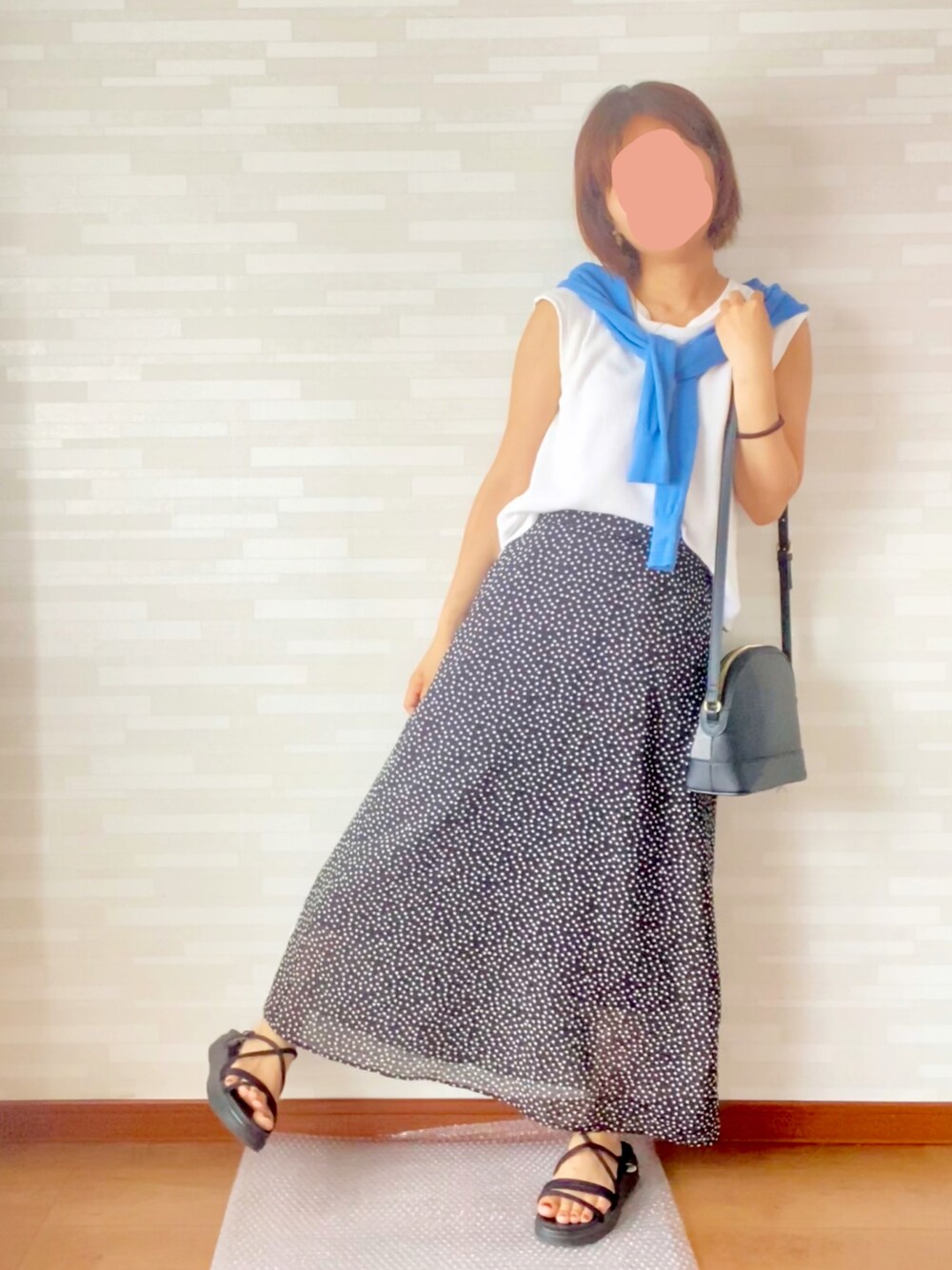 ドットのスカートを主役に モノトーンもいいけど ブルーのカーディガンを肩掛けにして 程よくアクセントに✨