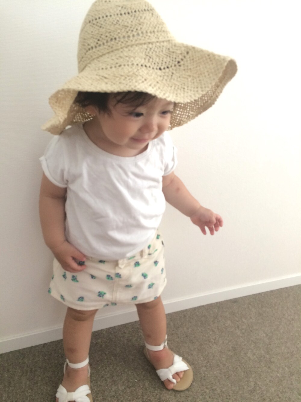 お下がりで貰ったGAPの可愛いスカートを着てみました♡ 帽子は嫌がってなかなか被ってくれないけどとても可愛くなります。 サンダルも女の子らしくて♡