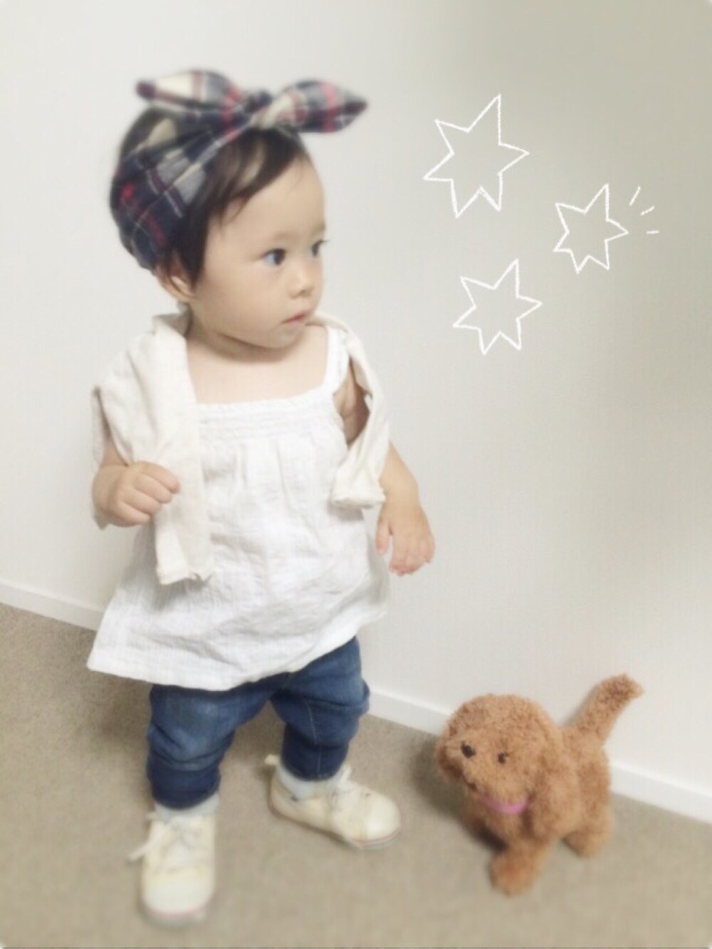 いつも♡、save、フォローありがとうございます(*^^*) 嬉しいです♪ ママのヘアバンドをつけてみたくて無理矢理後ろをゴムで短くしばって付けさせてみました(´・Д・)」 あとはシンプルなコーデ。 シンプルにして小物を目立たせるコーディネートが好きです♪( ´▽`) 娘は頭に何か付けるのは嫌らしくすぐ取ってしまいますが…(ーー;)