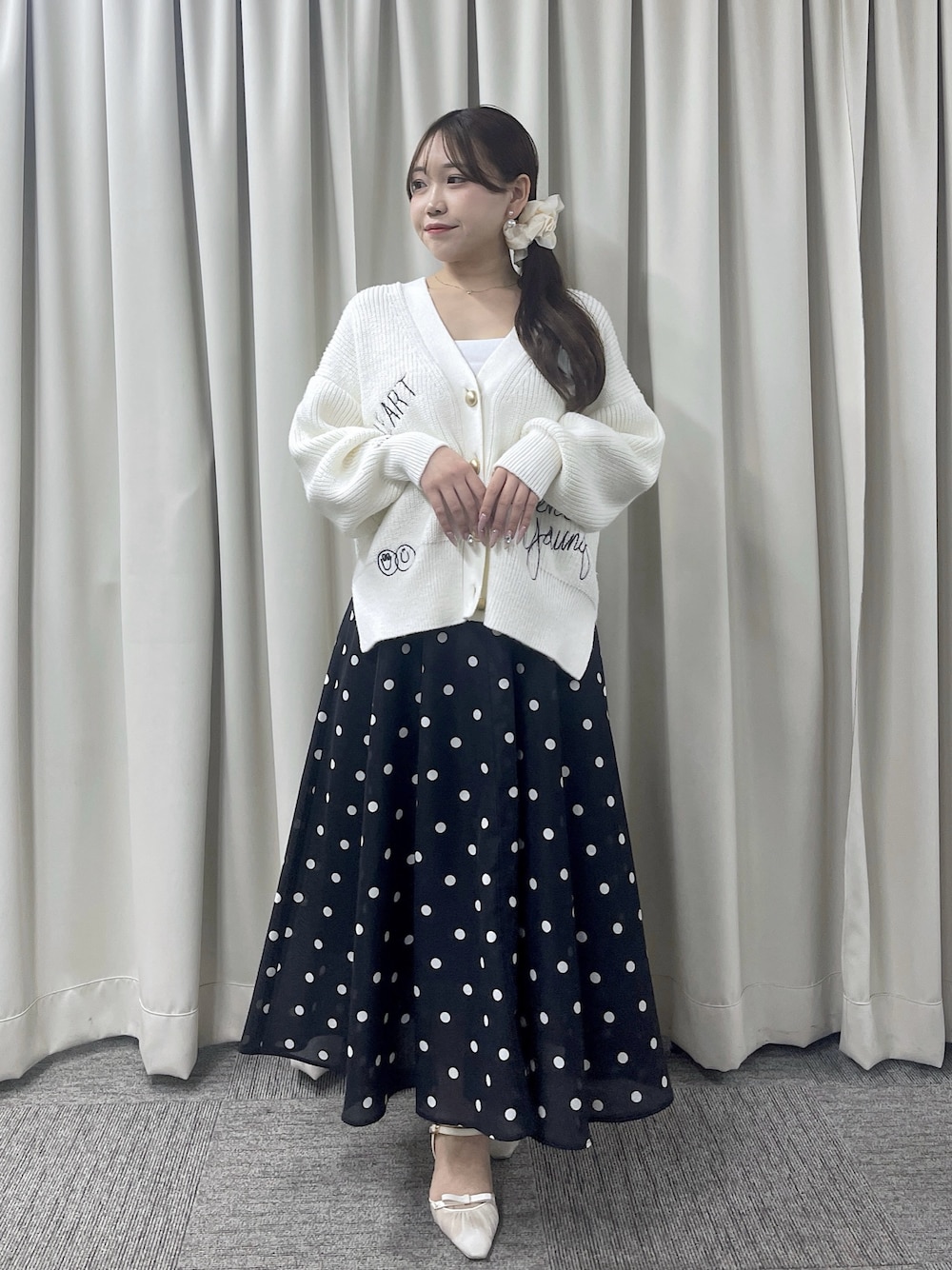 ♡tops 遊び心あるロゴ刺繍が目を惹く 一枚で主役になるカーディガンです♡ ゆったり感がありならもVネックで 抜け感のある大人シルエットに♩ やや厚みのある生地なので秋冬も 安心して着られます◎ ♡skirt 程よいハリ感があり、歩くたびにふんわり 揺れて女性らしさを引き立ててくれるスカート。 ハイウエスト× 太めベルトで 自然とスタイルアップが叶います◎ 甘さ控えめなドット柄で大人っぽく着られて コーデの主役になる一枚です♡ 〈 着用サイズ 〉 tops : F skirt : 38