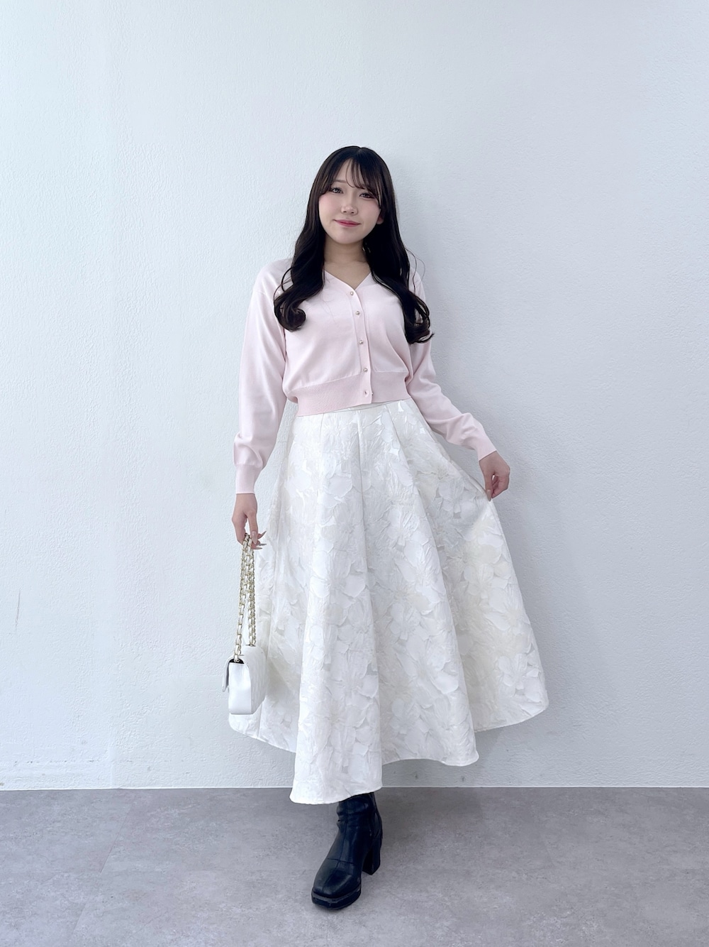 ♡tops 毎年定番のクールタッチUVシリーズの Vネックカーディガン。 接触冷感・UVカット・手洗い可能で しわになりにくい扱いやすさが魅力♡ ゴールド釦が上品で、一枚着としてや 羽織りとしても使える万能な一枚です♩ ♡skirt 上品なフラワージャガードが目を惹く コーデの主役になるフレアスカート。 程よいハリ感とふんわり揺れるシルエットが 女性らしく華やかな印象に♡ 高めのウエスト位置で自然とスタイルアップし 後ろゴム仕様で穿き心地も快適な一枚です◎ 〈 着用サイズ 〉 tops : F skirt : 38