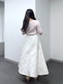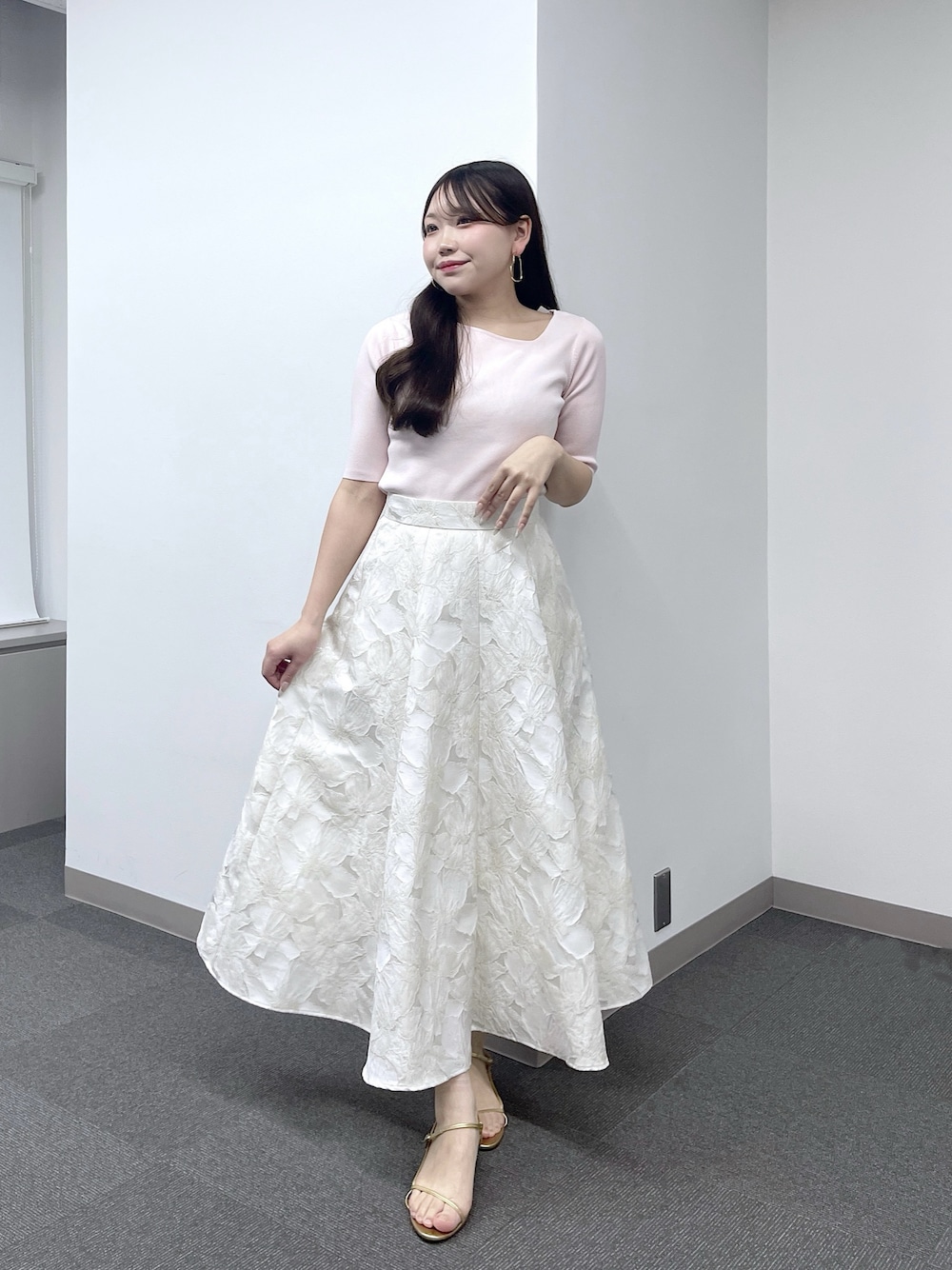 ♡tops 定番に差をつける、 アシメネックが印象的なクールタッチニット。 UVカット&接触冷感素材で着心地も快適 きちんと見えするのでお仕事シーンにも◎ コンパクトなシルエットと5分袖で華奢見え しつつ、着回し力も抜群な一枚です♡ ♡skirt 上品なフラワージャガードが目を惹く コーデの主役になるフレアスカート。 程よいハリ感とふんわり揺れるシルエットが 女性らしく華やかな印象に♡ 高めのウエスト位置で自然とスタイルアップし 後ろゴム仕様で穿き心地も快適な一枚です◎ 〈 着用サイズ 〉 tops : F skirt : 38