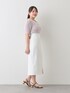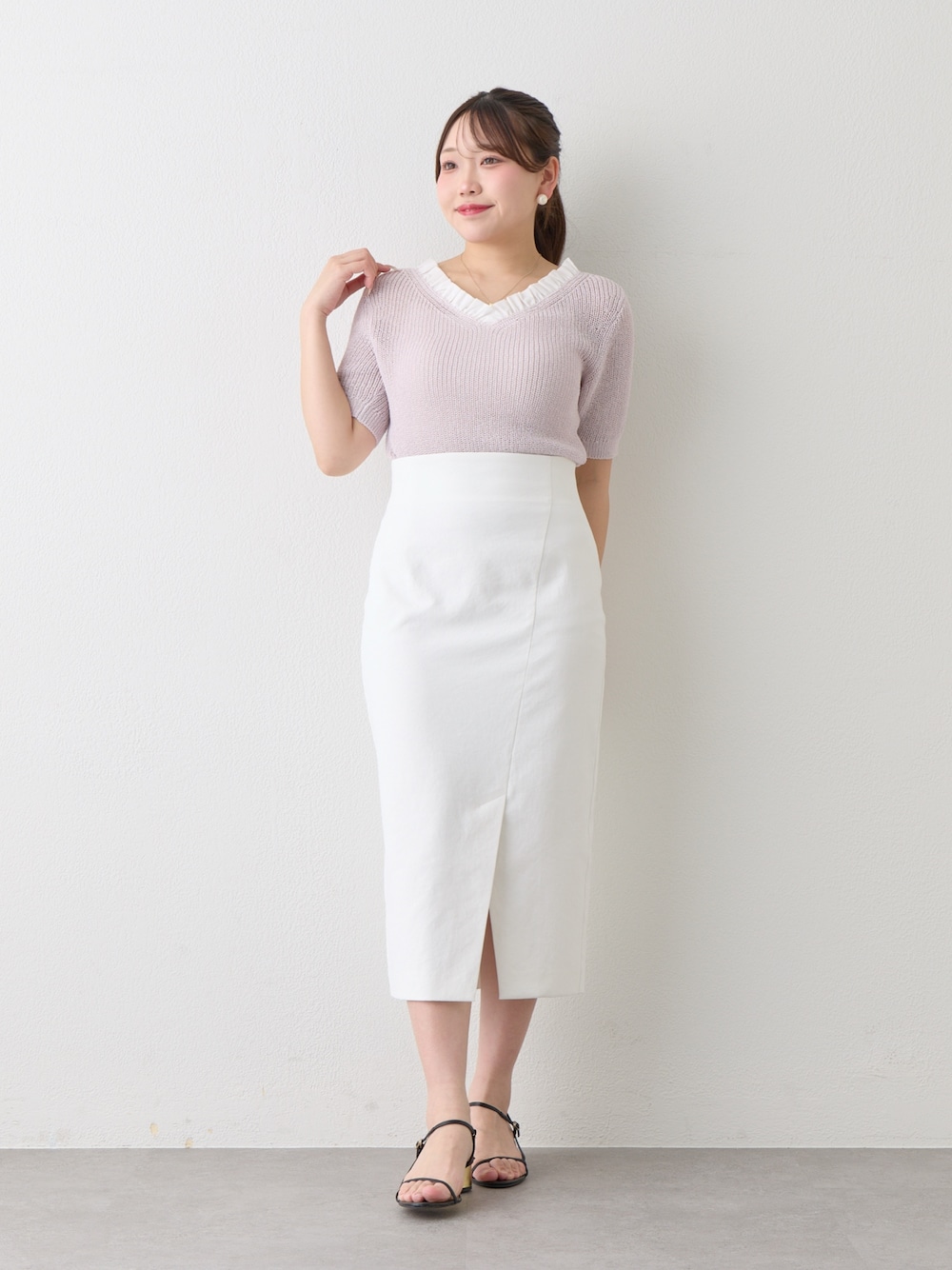 ♡tops 清涼感のあるペーパーヤーン(和紙混) 素材を使用したVネックニット。 ドライタッチで風合いで春夏もさらりと 快適に着られるのが嬉しいポイント◎ さりげないフリルデザインが顔まわりを 華やかに演出する一枚です♡ ♡skirt 縦ラインを強調するラップ風デザインで すっきりとしたシルエットを叶えるスカート。 ドライタッチ素材と程よいストレッチ性で きちんと感と快適さを両立◎ 通勤からきれいめカジュアルまで オンオフ問わず活躍する一本です♡ 〈 着用サイズ 〉 tops : F skirt : 38