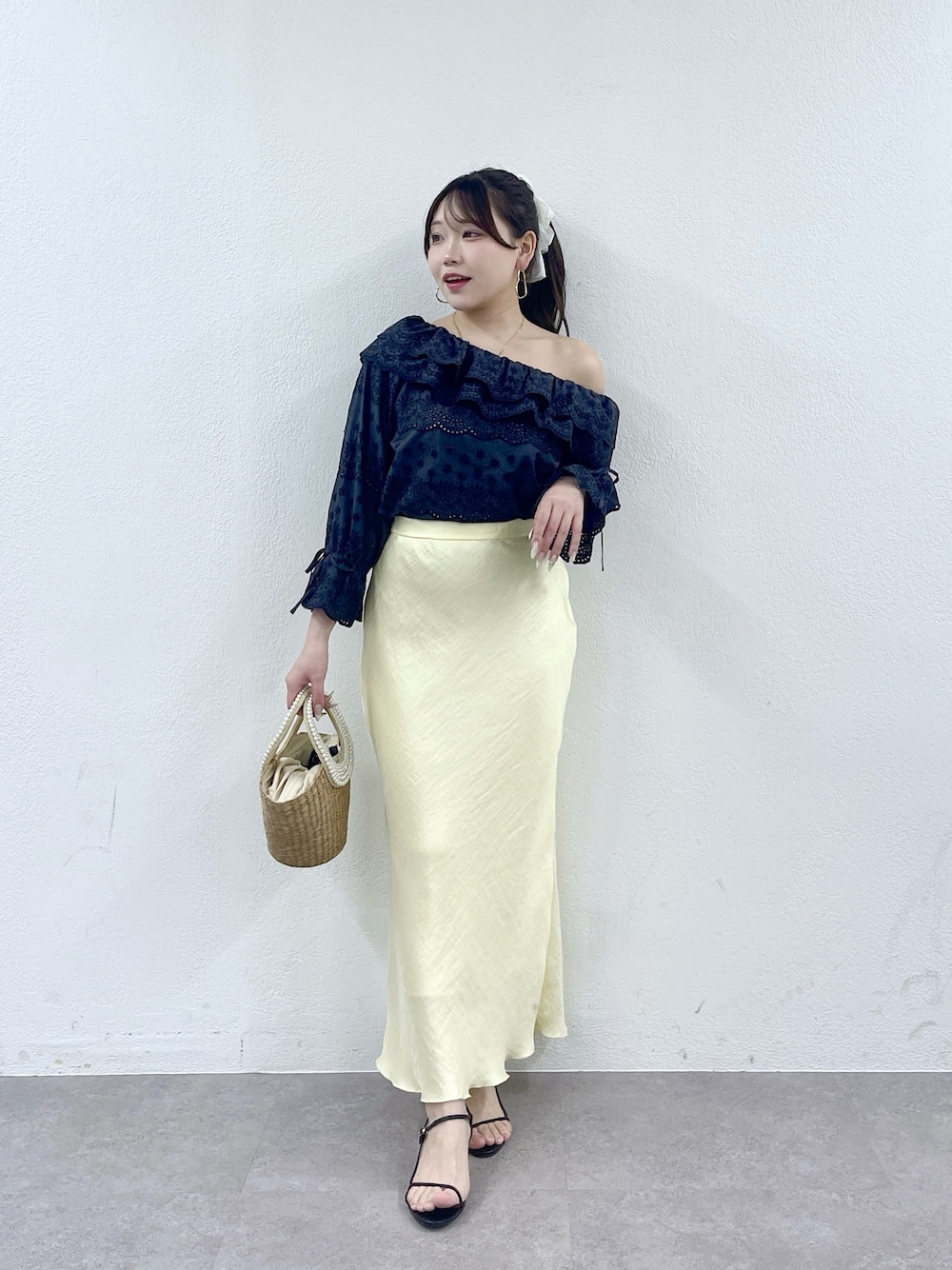 ♡tops 着るだけでシーズンムードを高める スカラップ刺繍のブラウス。 ワンショルデザインが鎖骨や肩のラインを美しく 引き立て、2段フリルとキャンディスリーブが 程よい甘さをプラスします♡ アウトスタイルでも映える、主役級の一枚です ♡skirt ツヤっとさりげなくきらめく素材感が 大人可愛いサテンスカート。 すっきりとしたシルエットながら バイアス生地で履き心地も抜群◎ どんなトップスでも大人っぽく決まります! カラー&サイズ展開も豊富なので 自分にぴったりの一枚が見つかるはず☆彡 〈 着用サイズ 〉 tops : F skirt : TM