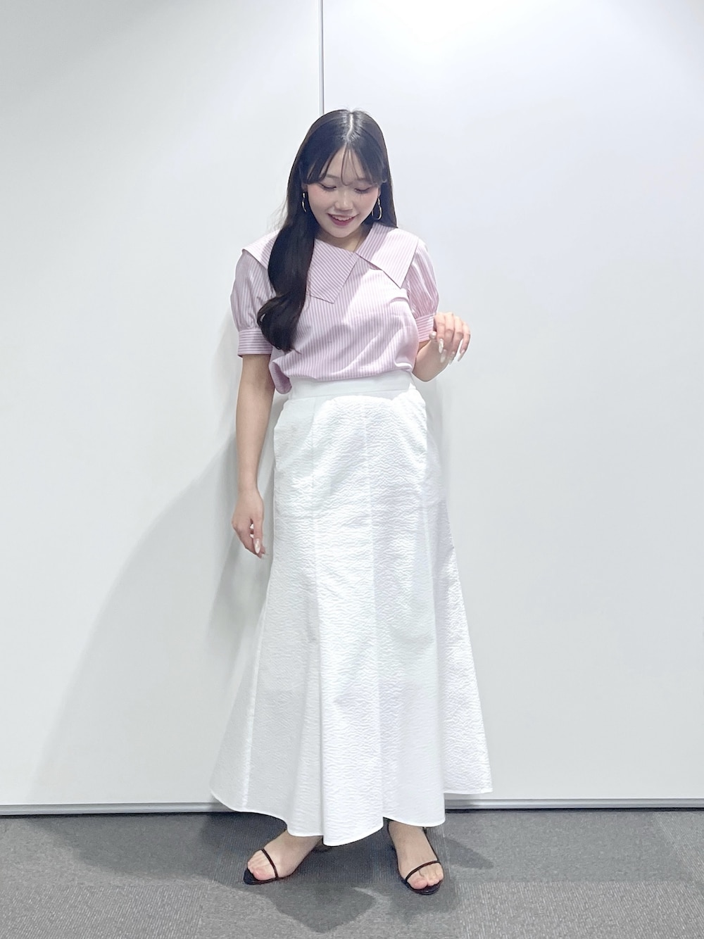♡tops 涼しげなストライプ柄と 大きめ襟が目を引く主役級ブラウス。 顔まわりを華やかに見せつつ、小顔効果も◎ デニムで甘めカジュアルにも、スカートや スラックスで上品コーデにも着回せます♡ ♡skirt さらっとしたサッカー素材で涼やかに着られる 春夏にぴったりのマキシスカート。 裾にかけて広がるマーメイドシルエットが 女性らしいラインを演出します♡ 同素材のブラウスと合わせてワンピース風の セットアップスタイルもおすすめです♩ 〈 着用サイズ 〉 tops : F skirt : 38