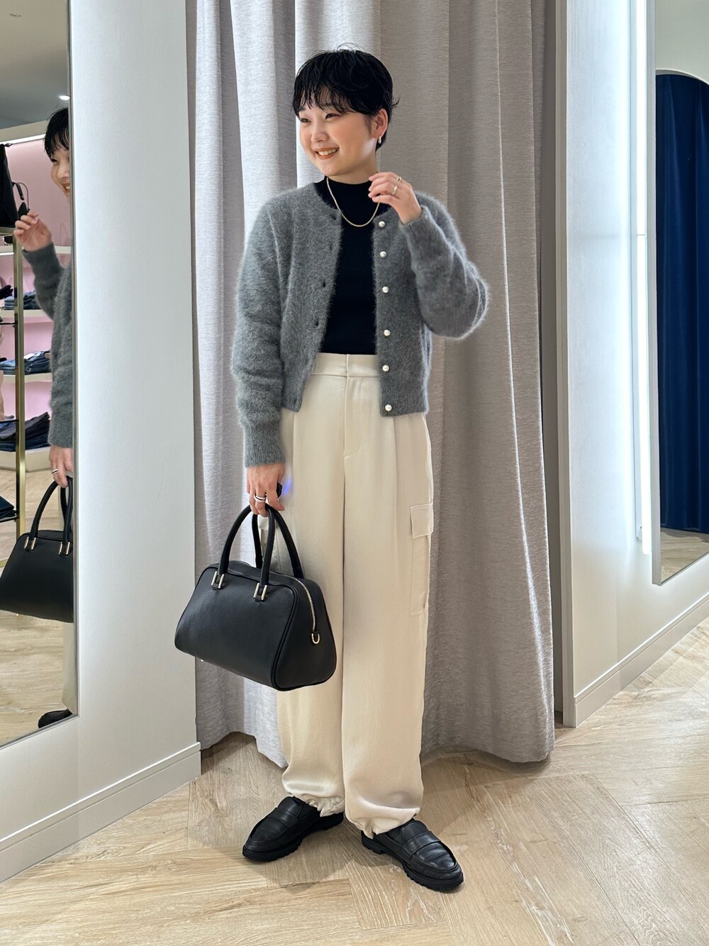 ✔️トップス カーディガンは小柄の方でも着やすい丈です◎ ハイネックのニットの上から着て、 チクチク感はほとんど無く柔らかい肌触りです! ハイネックのニットはウールが入っていないので、サラッとした着心地! 程よく厚みがあって透けが無く、1枚でも映えるラメニットです◎ ✔️パンツ サテンで綺麗めに着られるカーゴパンツ♪ ドローコードで裾をクシュっとさせると、 低身長さんでもお直しなしで履けちゃいます◎ 裏地付きで、腰回りにも程よくゆとりがあるので、インナーのラインを拾わず着やすいです! 足元は、少し綺麗めな靴を合わせると大人カジュアルにまとまります!