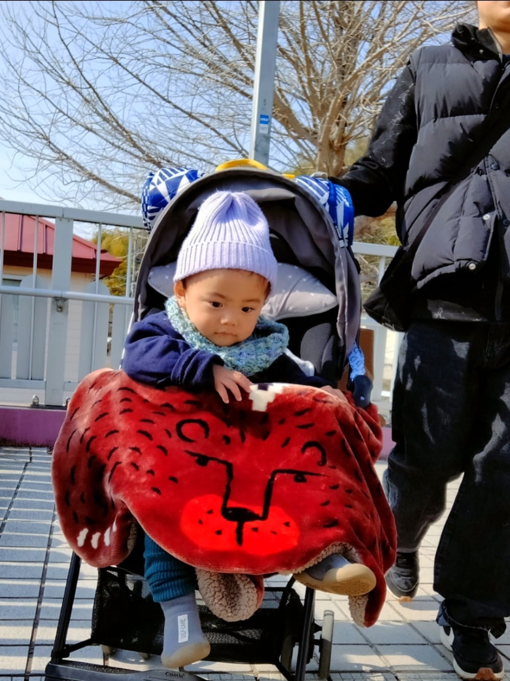 ブラウン系のブランケットを着用したキッズの春コーディネートの1枚目の写真
