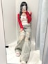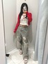 155cm/骨格ナチュラル/24cm (Lサイズ) camisole :アイボリー cardigan:レッド pants:ブルー shoes :ベージュ シャーリングとリボンが可愛いキャミソール◆* 肩もフリルで紐が太く生地もしっかりしているため暑い日は1枚でも安心して着ていただけま す🍒 スカートと合わせてガーリーコーデでも、デニムと合わせてカジュアルコーデにも使っていただけます💌🩶 アイボリーは赤いリボンが目を引くので赤のシアーカーデと着てみました♪