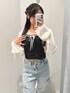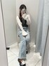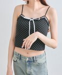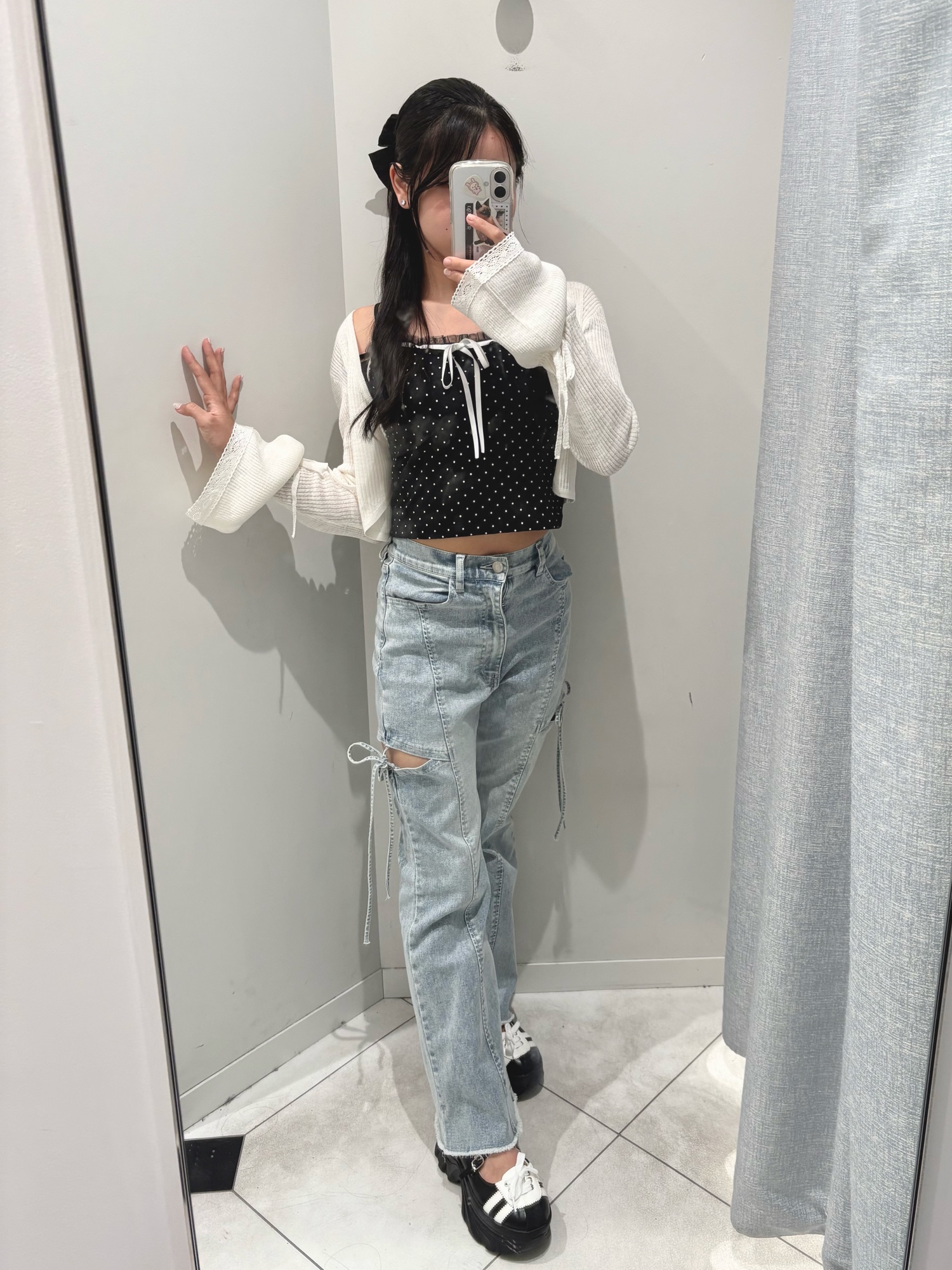 155cm/骨格ナチュラル/24cm (Lサイズ) tops:ブラック cardigan:オフホワイト pants :サックスブルー shoes:ブラック 流行りのドットと胸元のフリルがポイントのキャミを使ったコーデ⟡.* ボレロは丈が短めの作りなのでスタイルアップして見せてくれます💞