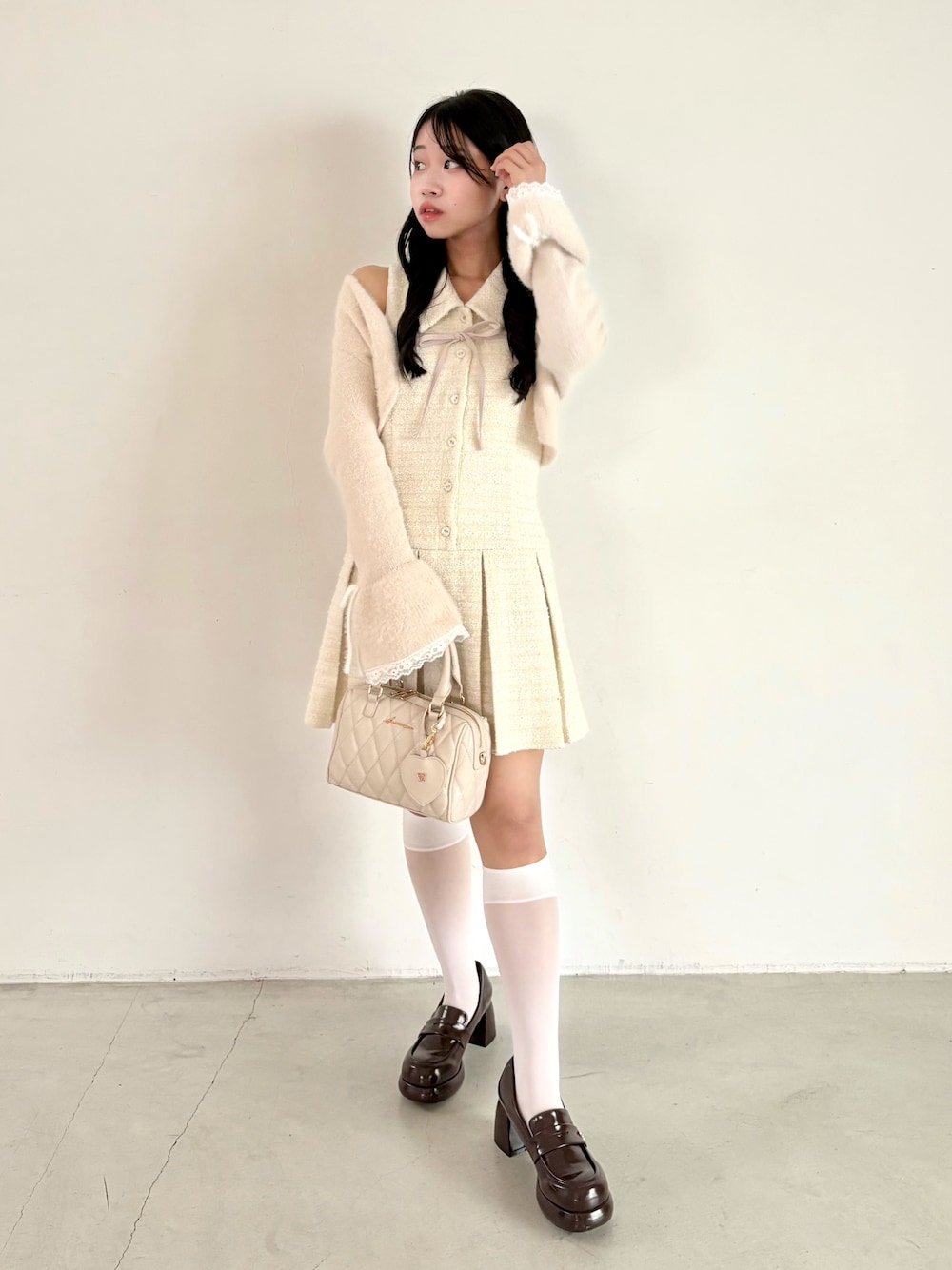 155cm/骨格ナチュラル/24cm (Lサイズ) onepiece :アイボリー bag : ベージュ shoes:ブラウン ゆいさん企画の大人気ノースリワンピの新色★* ツイードのホワイトは1枚で甘〜いガーリー コーデが完成します🎀 お出かけや参戦服など特別な日に着たいアイテムです♥