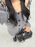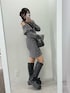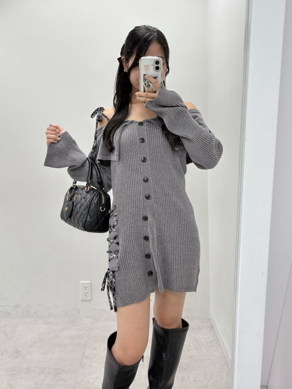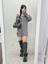 155cm/骨格ナチュラル/24cm (Lサイズ) onepiece : チャコールグレー bag :ブラック shoes:ブラック 特別な日に着たいオフショルのミニワンピース★◆ タイトなシルエットと長めの作りの袖でスタイルアップして見せてくれます★ 丈やオフショルは肩のリボンの結び具合で調節可能です!!