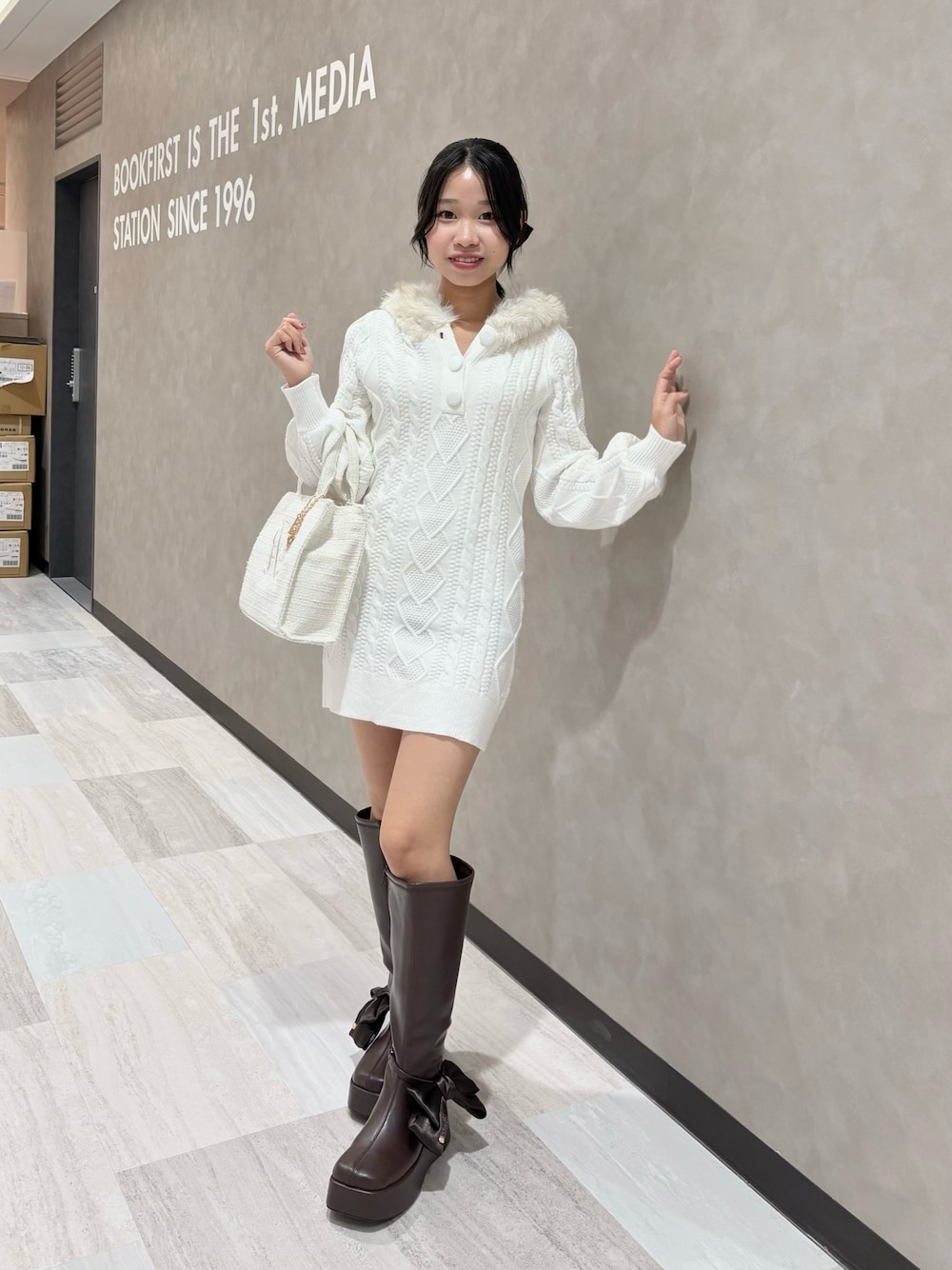 155cm/骨格ナチュラル/24cm (Lサイズ) onepiece: オフホワイト bag :アイボリー shoes: ブラウン スタイルアップ効果抜群のニットワンピース⟡.* ウエストで程よくくびれるシルエットで大人ぽく着ていただけます🎀 155cmで太ももがちょうど隠れる丈です!! フワフワのファーがポイントになって可愛いです♡