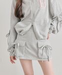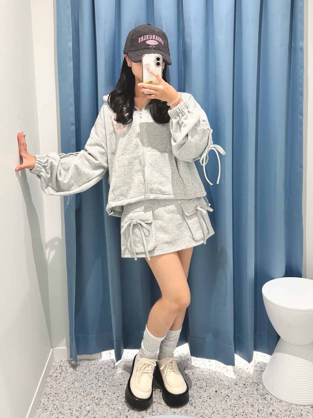155cm/骨格ナチュラル/24cm(Lサイズ) topS: トップグレー skirt :トップグレー shoes:アイボリー cap:チャコールグレー 首元とロゴの異素材がポイントのショートパーカー🎀袖にもリボンが付いているのでスポーティになりすぎない、甘さがプラスしたデザインなのでガーリー好きさんにもおすすめです★裾の絞り具合も調節でき、スタイルアップしてみせてくれます.⋆𝜗𝜚