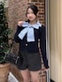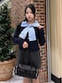 155cm/骨格ナチュラル/24cm (Lサイズ) tops: ネイビー pants: チャコールグレー shoes: ブラック bag:ブラック 大きなリボンが目をひくトップス★*。 ケーブルニットとシャツがくっついているので1枚でレイヤード風に着ていただけます、ミニ丈のボトムスと合わせてガーリーにも、デニムと合わせのカジュアルコーデでも大活躍します!