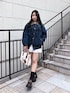 155cm/骨格ナチュラル/24cm(Lサイズ) Jacket: ワンウォッシュ skirt :ホワイト bag :ブラウン 春にピッタリなデニムブルゾン★* 丈は155cmで腰が隠れるくらい長さです! レザーの襟は付け外し可能なためその日のコーデに合わせて着回しできます︎👍🏻 ̖́- 胸元のリボンがあるおかげでカジュアルになりすぎません!どんなテイストのお洋服とも合わせやすいアイテムになっています
