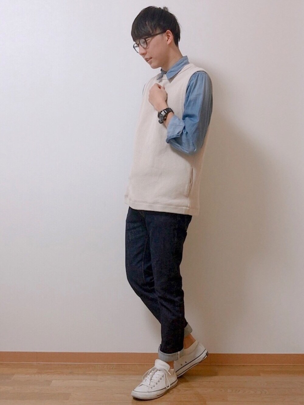 カジュアルデニムシャツコーデ✨ デニムシャツ×ベージュベストの絶妙な組み合わせで春らしさを出してみました😆 デニムスタイルにコンバースはぴったりです👌 気に入っていただけたら幸いです😭 シンプルでウケの良いコーデだと思うので、試していただけたら嬉しいです!😁 今回もご覧いただきありがとございました🙇