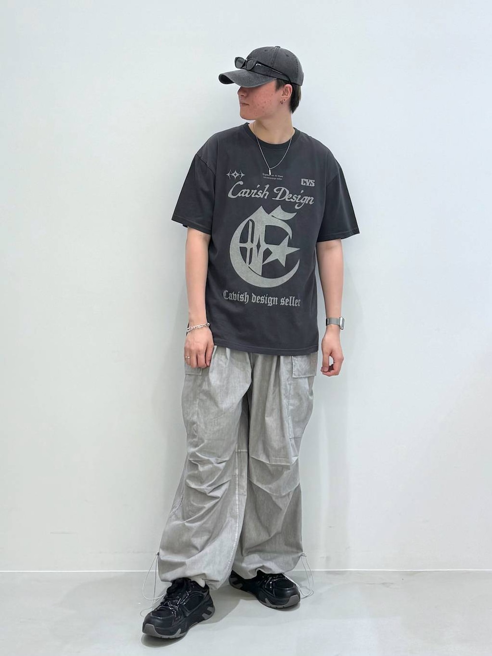 ⭐各アイテムのおすすめポイント  ̄ ̄ ̄ ̄ ̄ ̄ ̄ ̄ ̄ ̄ ̄ ̄ ̄ ̄ ̄ ̄ ̄ 【トップス】CAVISH:L メインのチャコールとデザインの色はグレーで似てる色を使っておりとても可愛いTシャツになっております! サイズ感は少し大きく作られておりS~Lまであるので自分好みの大きさで着て頂けます! 【ボトムス】THE MILE:L グレーに黒色でくすんだ色が入っており可愛いアイテムとなっています! トップスを黒やチャコールの色で持ってきてあげるととても輝くアイテムになっています! サイズ感は太めのカーゴパンツとなっており大きめに履けるアイテムとなっております!