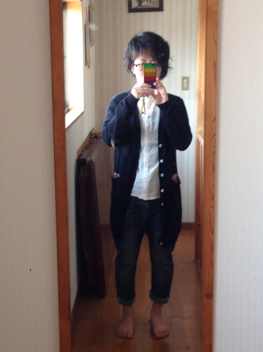 ピアスなんて見えてやしねぇ(笑) カーディガンはチチカカ。 ジーパンは会社で買ったからブランドわからんけど、ダブルウエストでサルエル。結構使いやすい。