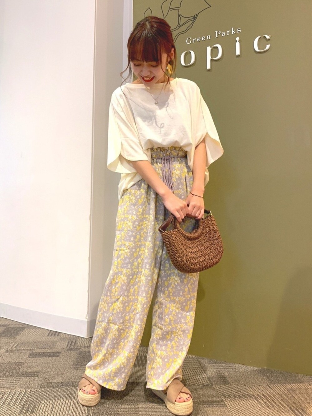 パステルカラーの柄パンツがとってもかわいい💓 ウエストは紐で結べて調整できるから ゆったりしたスタイルがお好みの方には嬉しいつくり💭☺️ 靴、小物は色合わせで統一感を出せばオシャレ見え!! 髪はまとめてアップスタイルで夏らしく🌞🌴🌺✨