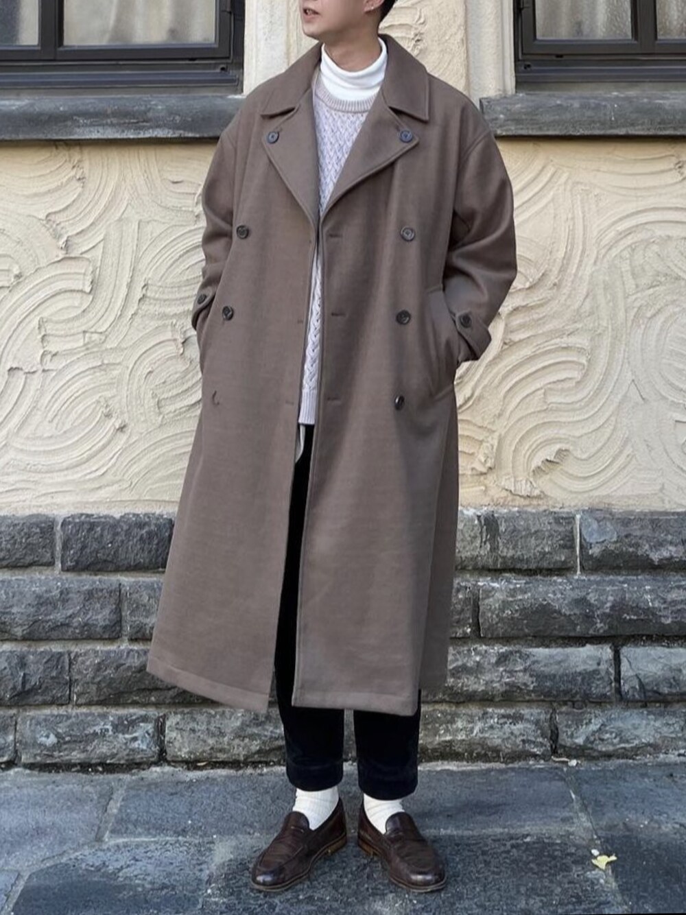 rikのトレンチコート「ストレッチ テックメルトン / マキシ丈 ロング オーバーサイズ トレンチコート」を使ったコーディネート