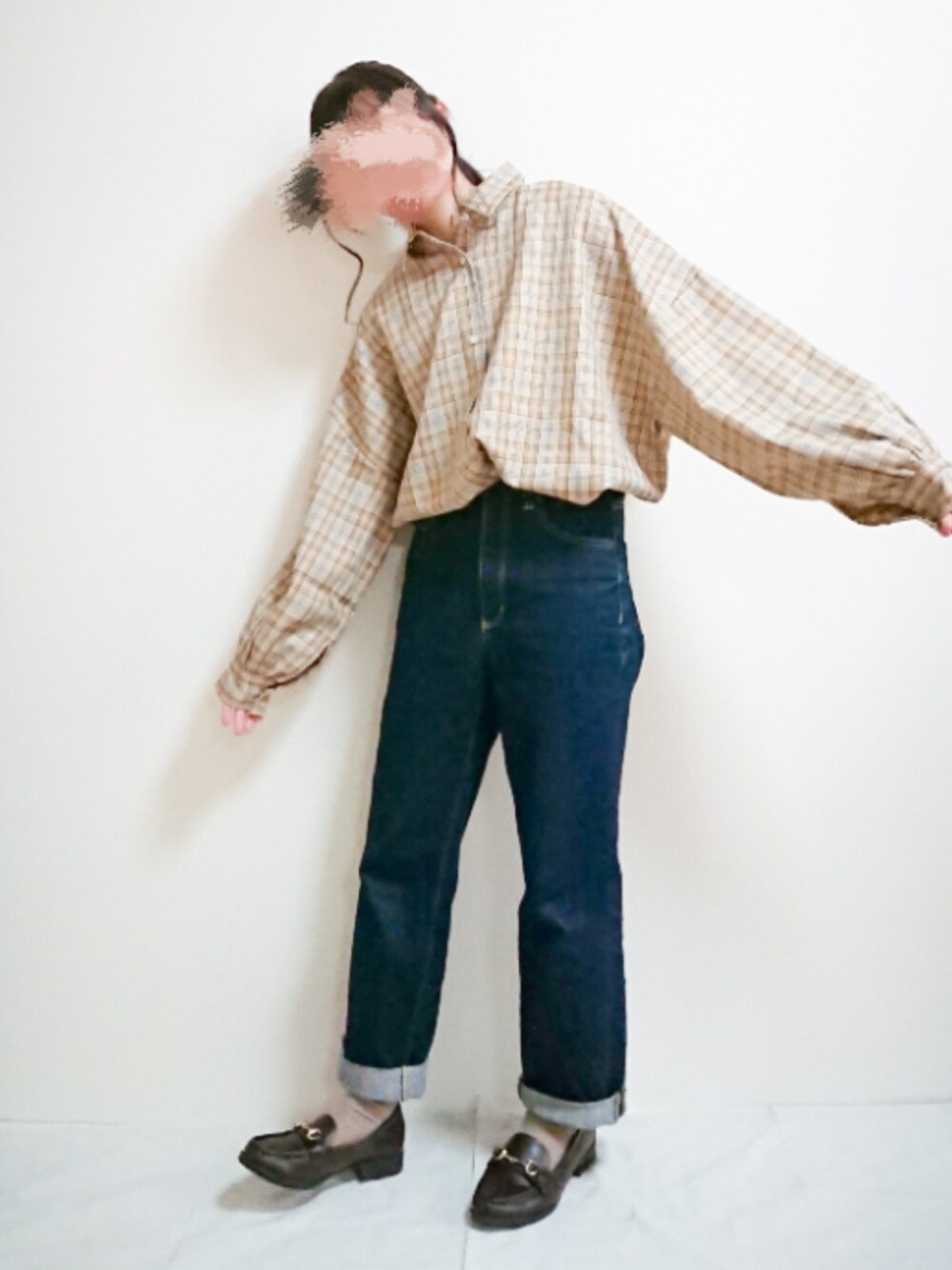 つむぎのシャツ/ブラウス「チェック柄袖ボリュームシャツ」を使ったコーディネート