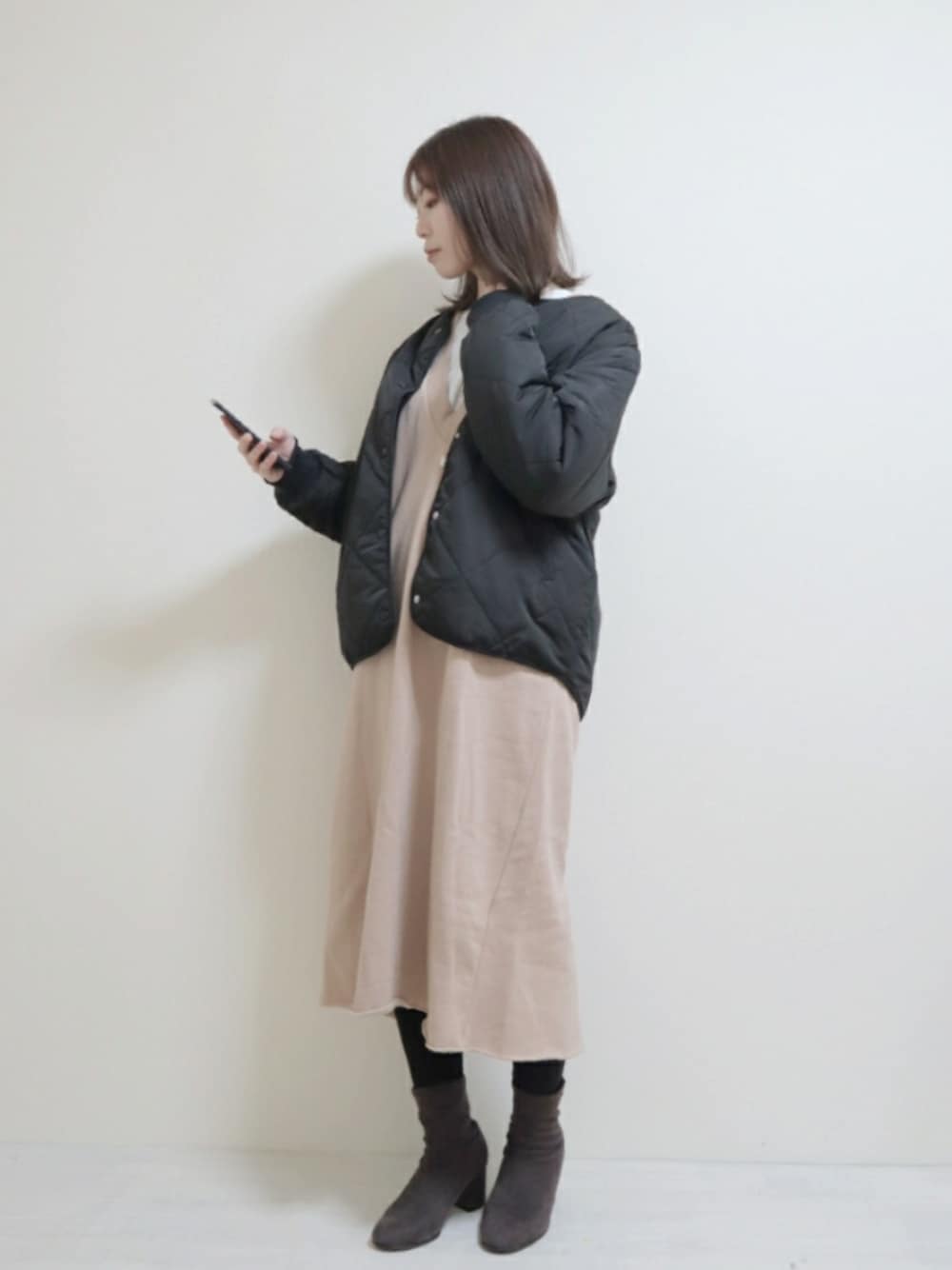 Samansa Mos2のピンクのワンピースは 裏起毛であったかい素材です·͜· ❤︎ キルティングジャケットを羽織って あったかい冬コーデ☃︎