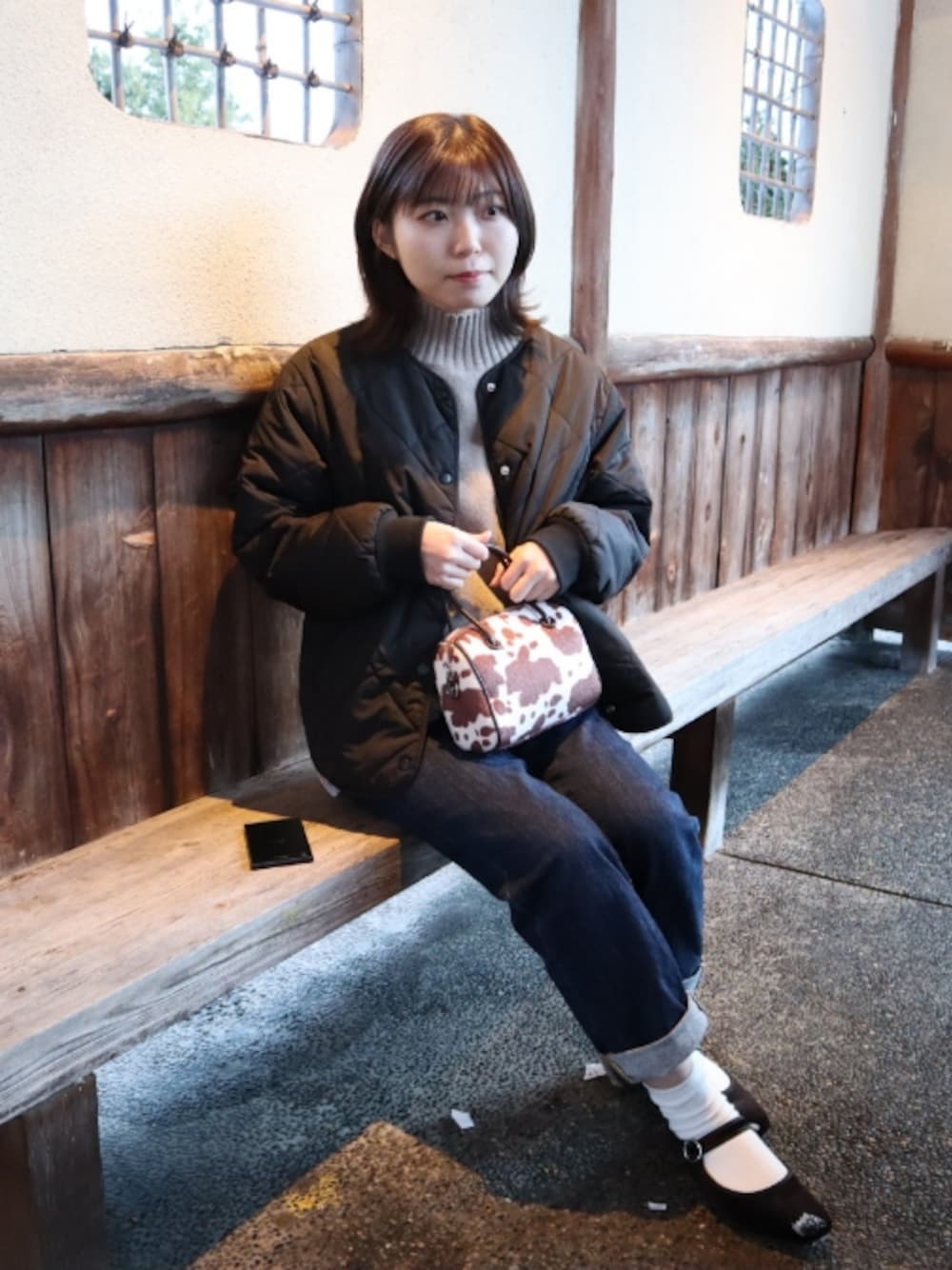 大人カジュアルコーデ❤︎𓈒𓂂𓏸 シンプルな洋服に牛柄のミニバッグを合わせるのが 最近のお気に入りコーデ( ⍢ )