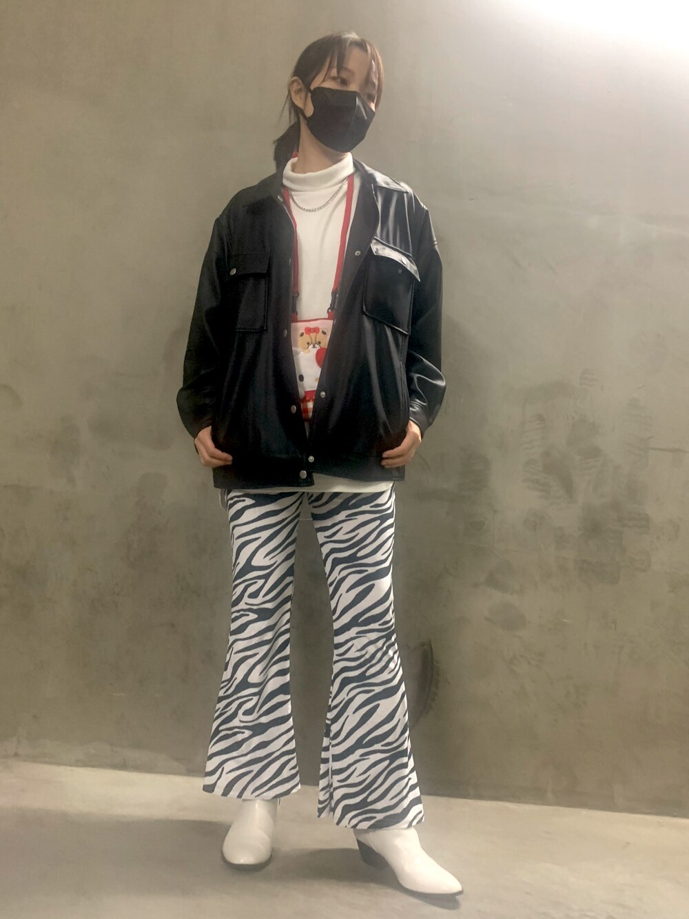 前髪を上げたのでかっこいいめ?にしてみました!キティさんを取り入れてギャップ狙ってます😎フェイクレザーのジャケット可愛いですよね♡