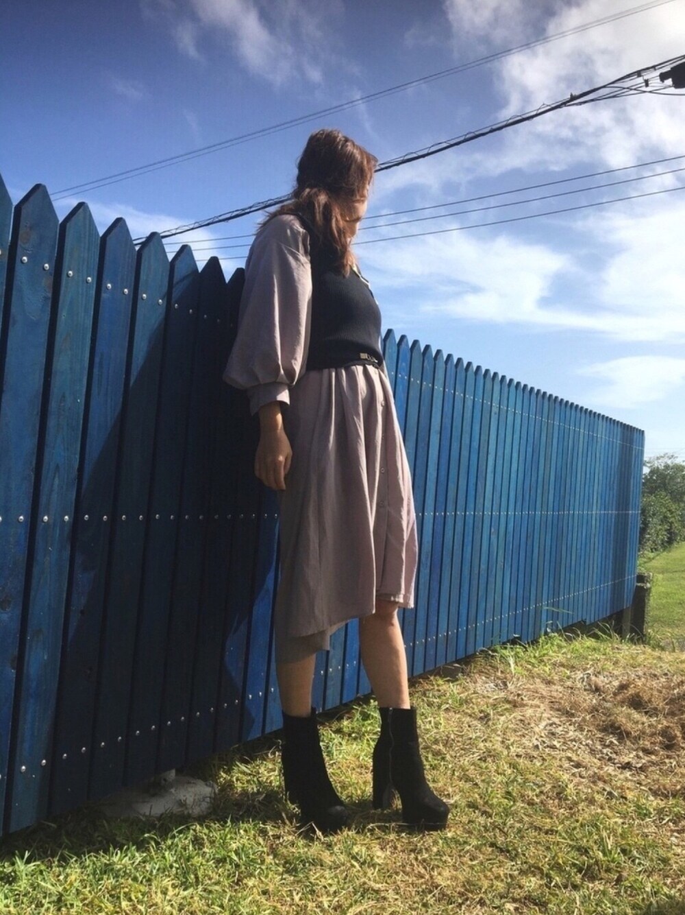 シャツワンピに黒ベスト、細ベルトをしてレイヤードスタイルに。