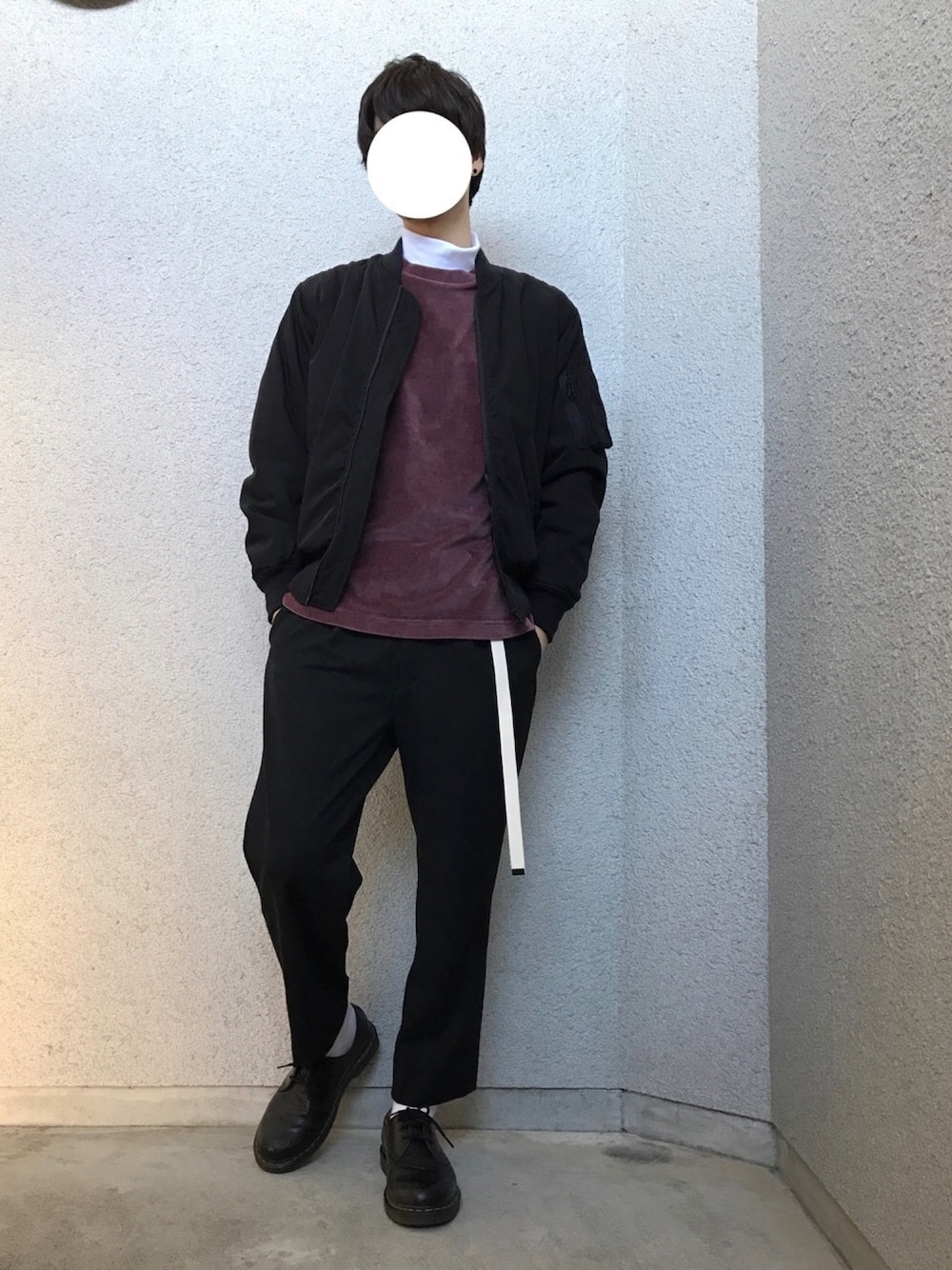 いま流行りの(?)ベロアを取り入れてみました🤘ピンクというか最早あずき色が暗くなりがちな冬コーデの差し色にめちゃくちゃいい感じ。 MA-1はシンサレート素材でかなりあったかいです!11月くらいに定価で買ったけど今はセールで半額になってます…笑 個人的に今日のコーデはベルトがいいアクセントになってるかなと思ってます😌 ちなみにわかりにくいけど下はワイドパンツです。