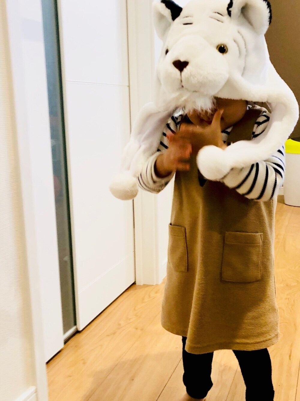 じーじ、ばーばが持ってきたアニマル帽子390円、、ホワイトタイガーw 娘大喜びw 2歳3ヶ月