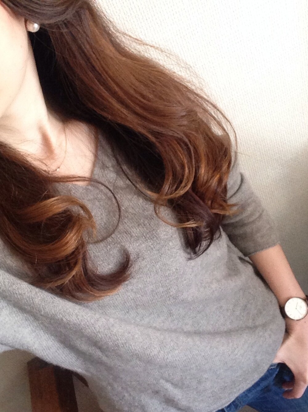 見えてませんが、デニムと合わせてカジュアルにしました♡ ピアスはパールでシンプルに🍀 今日はポカポカ陽気で気持ちいい🎵