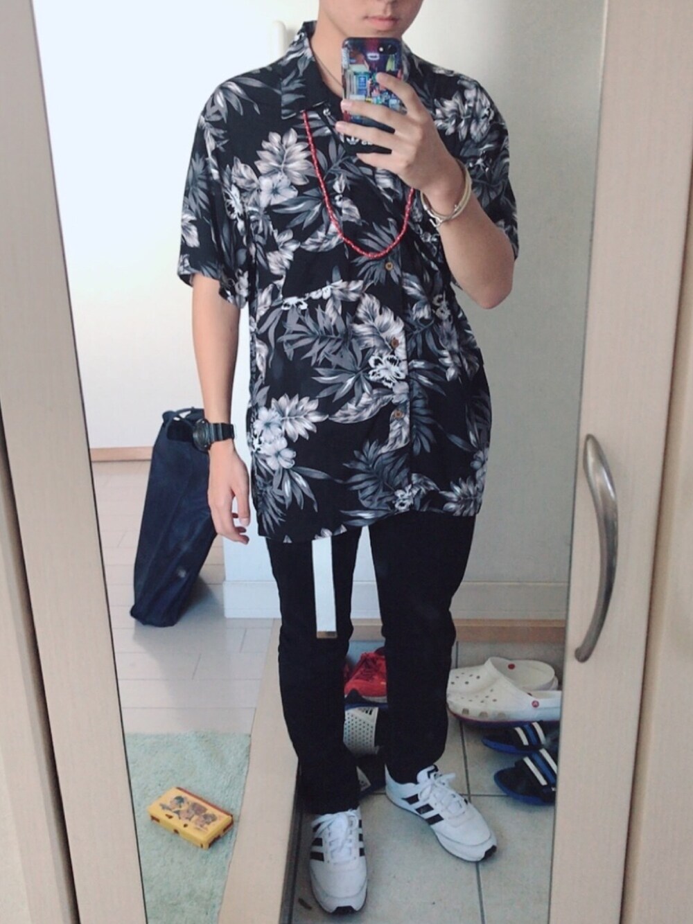 柄シャツと黒スキニーに、ガチャベルトと白スニーカーを合わせてみました✨ 腕回りが寂しかったので、腕時計とブレスレットを付けました⌚️ 白黒で寂しかったので、アクセントとして赤いビーズのロングネックレスを付けました📿 ・ビーズロングネックレス(赤):WEGO(ウィゴー)/¥1000 ・柄シャツ(黒×白):ROUSHATTE(ルーシャット)/¥2000 ・腕時計地割れデザイン(黒):G-SHOCK(ジーショック)/¥16000 ・ガチャベルト(白):WEGO(ウィゴー)/¥690 ・スキニーパンツ(黒):GU(ジーユー)/¥3500 ・スニーカー(白):adidas(アディダス)/兄貴のお下がり→¥0
