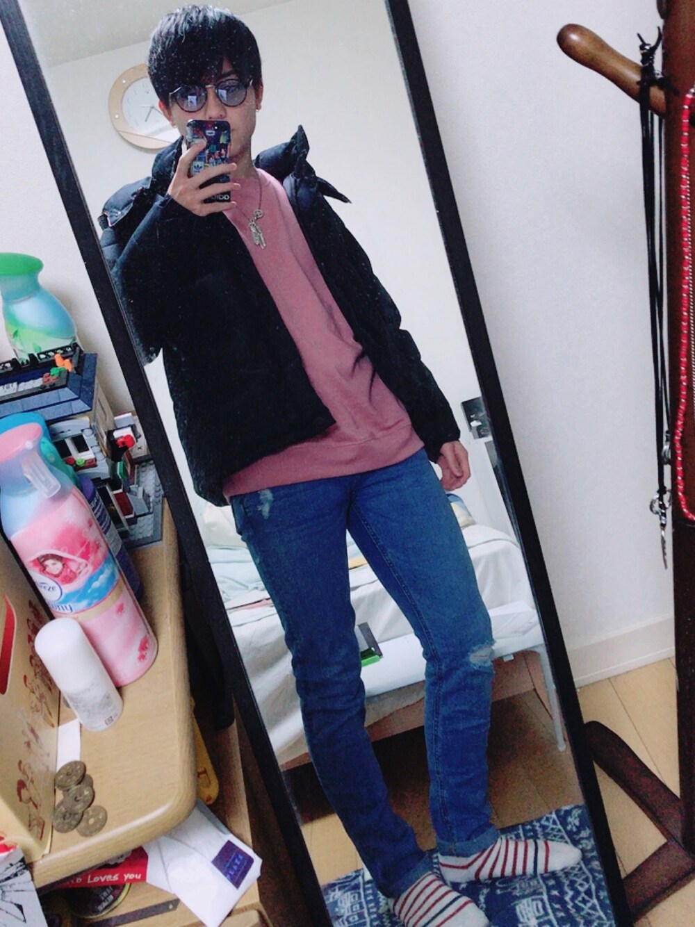 THE SHOP TKのダウンジャケットをアウターとして着ました✨ THE SHOP TKのダウンジャケットはネイビーです。 フードも取り外しできるのでオススメです。 SPINNSのピンクのスウェットはトレンドのオフショルダーになっていてすごく可愛くなっています💕 Bershkaのダメージデニムはこれで2700円と破格の値段!