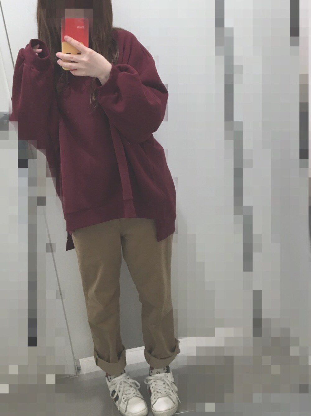 ワインレッドのスエットにゆるっとしたパンツを合わせました~₍ ᐢ. ̫ .ᐢ ₎♡♡ 靴下がちょっとダサいのは気にしないでください(笑)(笑) Sサイズで丈はちょうどいい◡̈*♡.°⑅