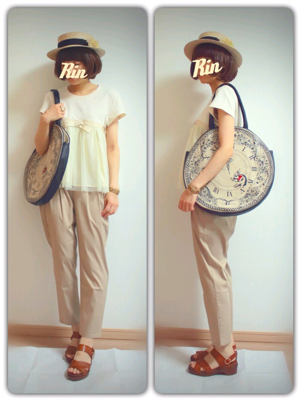 ここ最近珍しくパンツスタイルが多いです。 トップスがふわっとしているので すっきりしたボトムスを合わせました。 上は普通のカットソー素材、 下はチュール素材の異素材Tシャツは 可愛くて気に入ってます。 シンプルめな格好なので バッグはアクセントになるものにしました。