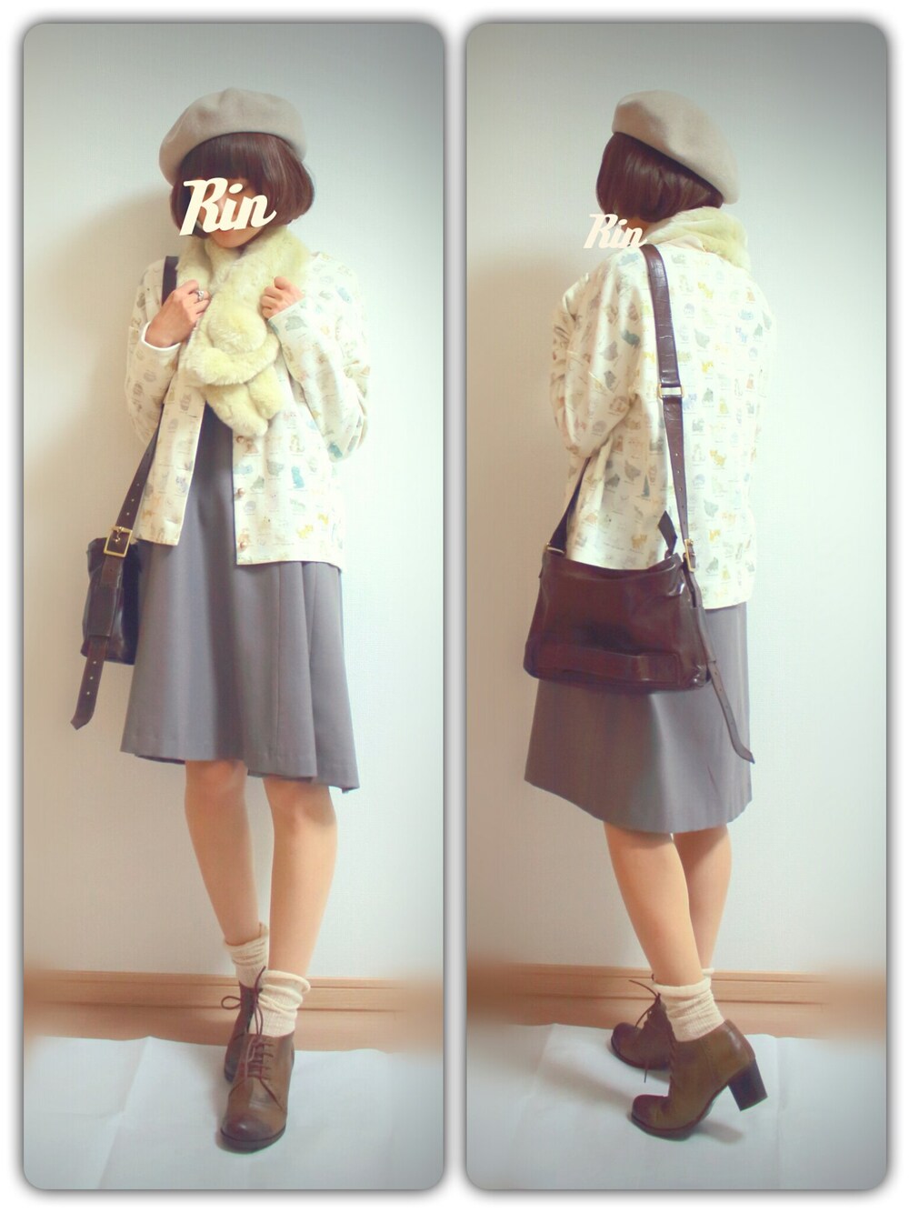 以前載せたコーデに今回はアウターと冬小物をプラス。 ねこいっぱいの総柄ジャケットにもふもふファーストール。 もふもふしてたり触り心地が良い素材だと ついつい触ってしまいます。