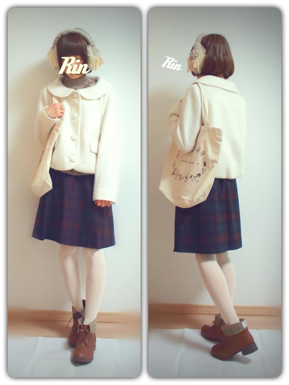 大きな衿、くるみ釦、ふわっと軽いコートに イヤーマフであったかコーデ。