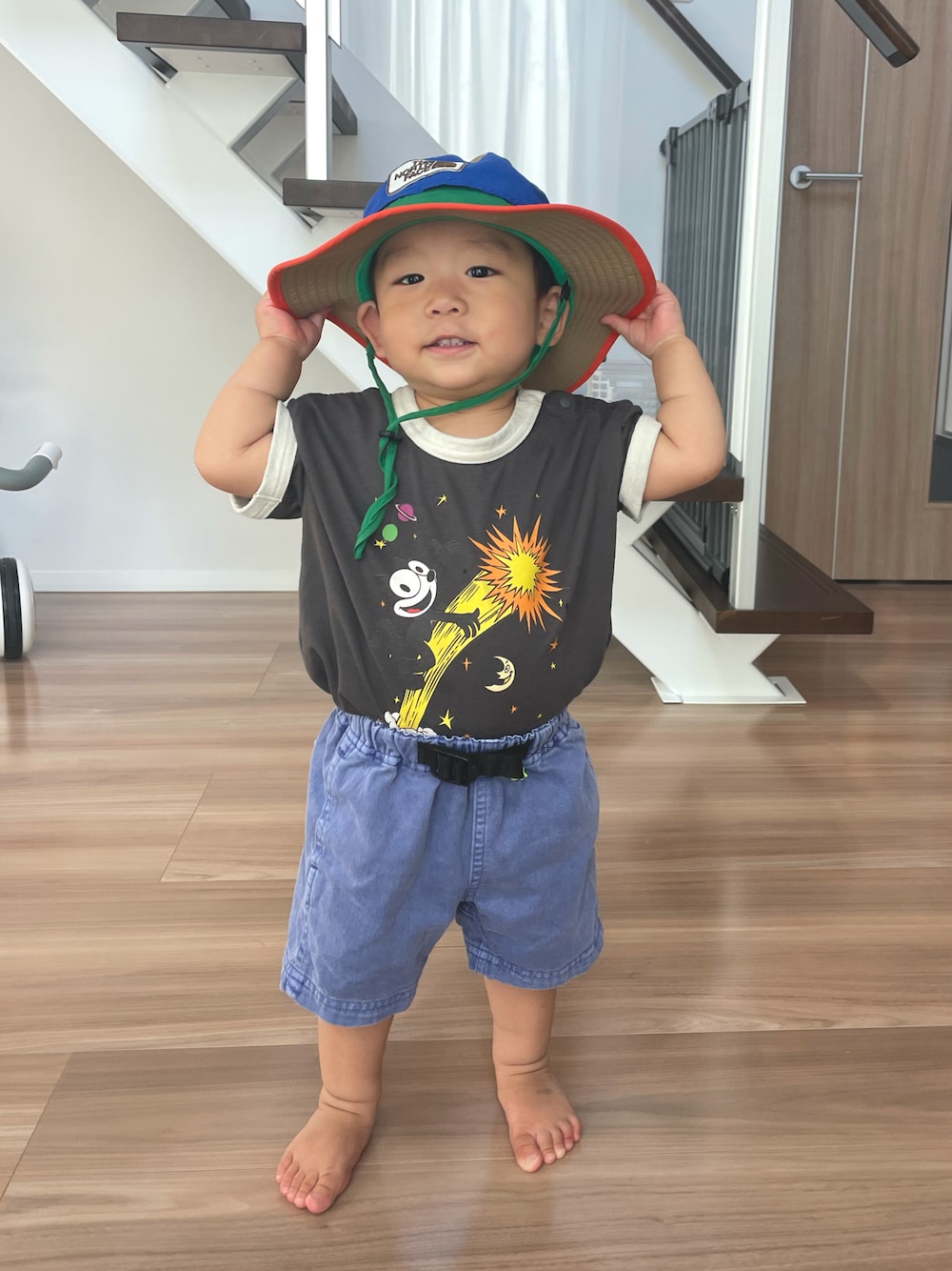 2023.9.10 最近自分で帽子を被れるようになりました☺️ 帽子を被るとお出掛けに行くと思って玄関に行こうとします(笑) 75cm/10kg
