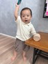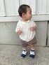 2023.9.16 お出かけコーデ🧸 歩きが安定したらスニーカーもオシャレなの買おうね♡ お友達が出産祝いでプレゼントしてくれた marimekkoの靴下がとってもカワイイ♡ 最近は「〇〇の人〜!」と言うとハーイと手を上げてくれます👋🏻