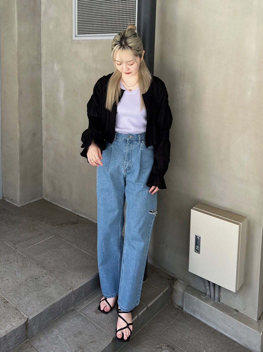 RINAのデニムパンツ「【3サイズ展開XS-M】サイドカットタックワイドデニムパンツ【低身長サイズ有】」を使ったコーディネート