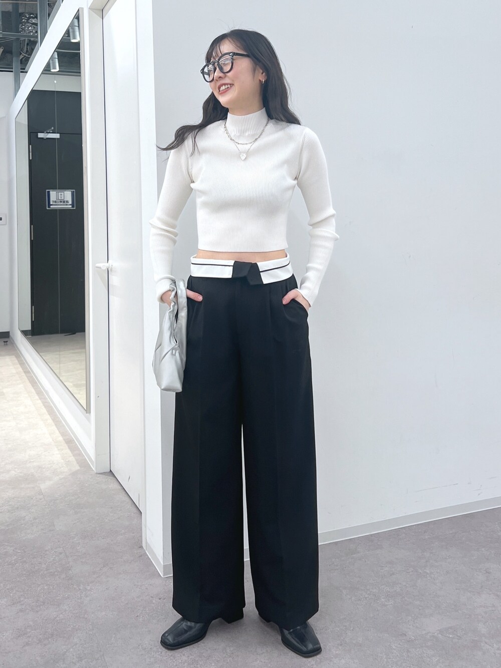 ニット(ホワイト/FR) へそ上あたりの丈感になっていて、ボリューム感のあるパンツ、スカートと合わせるとスタイルアップ効果抜群です! パンツ(ブラック/M) ワイドパンツがスタイル良く、シンプルなデザインが 2way使用で色々なスタイルに合わせられます!