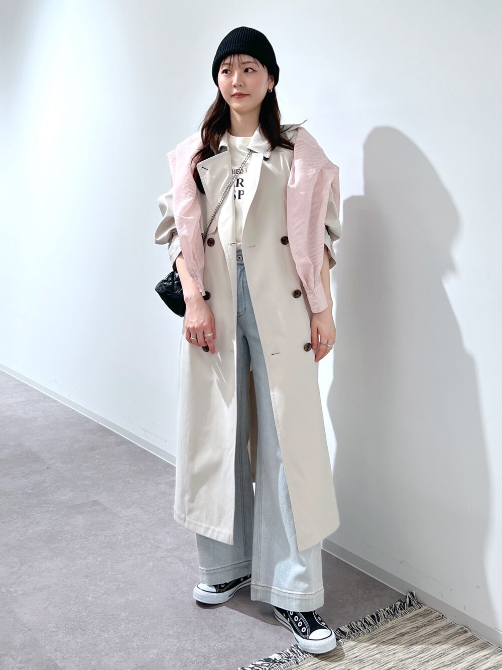 デニム(ハイブリーチ/M) 形がすごく綺麗でいろんなジャンルに合わせやすい!丈感も長くもなく短くもなくで、足が綺麗に見える長さです! トレンチコート(ホワイト/M) カジュアル、フェミニンどちらにも合うスタンダードなトレンチコート 丈感はすねあたりです! シャツ(ピンク/FR) 軽い素材なので、今の時期はトレンチコートにふわっと肩掛けしても可愛いと思います! 真夏まで冷房対策として使えるので万能アイテムです! Tシャツ(オフ/FR) 1枚でも!レースキャミワンピースやビスチェでレイヤードで着ても!何にでも合わせやすいロゴTシャツ