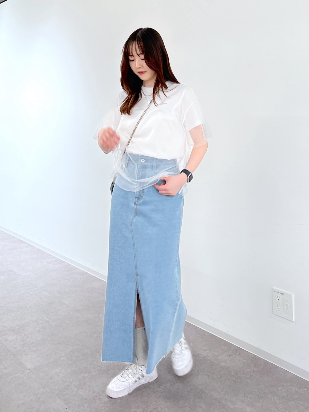 カットソー(オフ×オフ/FR) チュールとTシャツのセットです! セットできるのももちろん可愛いですが!別々でも着回しできる便利なアイテムです! デニムスカート(インディゴブルー/M) 深めのスリットがあり、可愛く、歩きやすいです! ロング丈になっていて、私は足首までしっかりと長さありました!